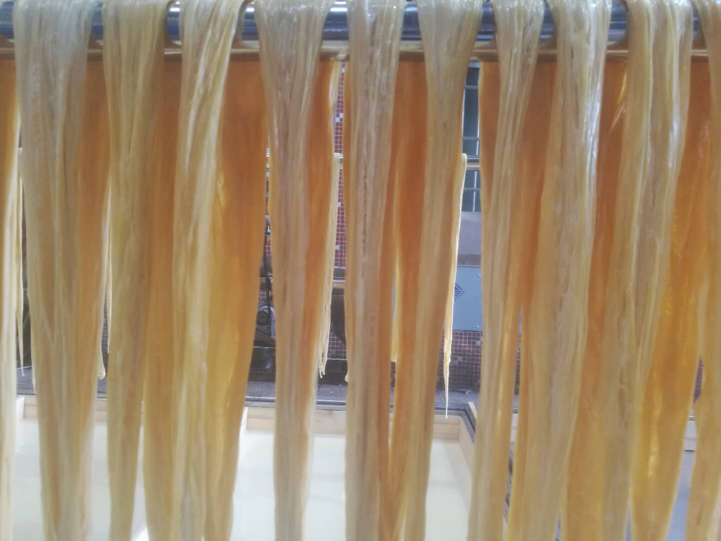 “一洗豆、二浸豆、三打漿、四隔渣、五擰漿、六煮漿、七鏟邊、八提膜、九掛灶、十曬晾”,遵照傳統古法,盡可能手工制作,還原腐竹本味。豆漿煮沸時,上層凝固的部分成條的挑起來,晾干后就成了腐竹,用水泡開后就可以拿來烹飪了,吃著又鮮又滑。現在的人多數是用腐竹機來半自動化制作腐竹,效率高。